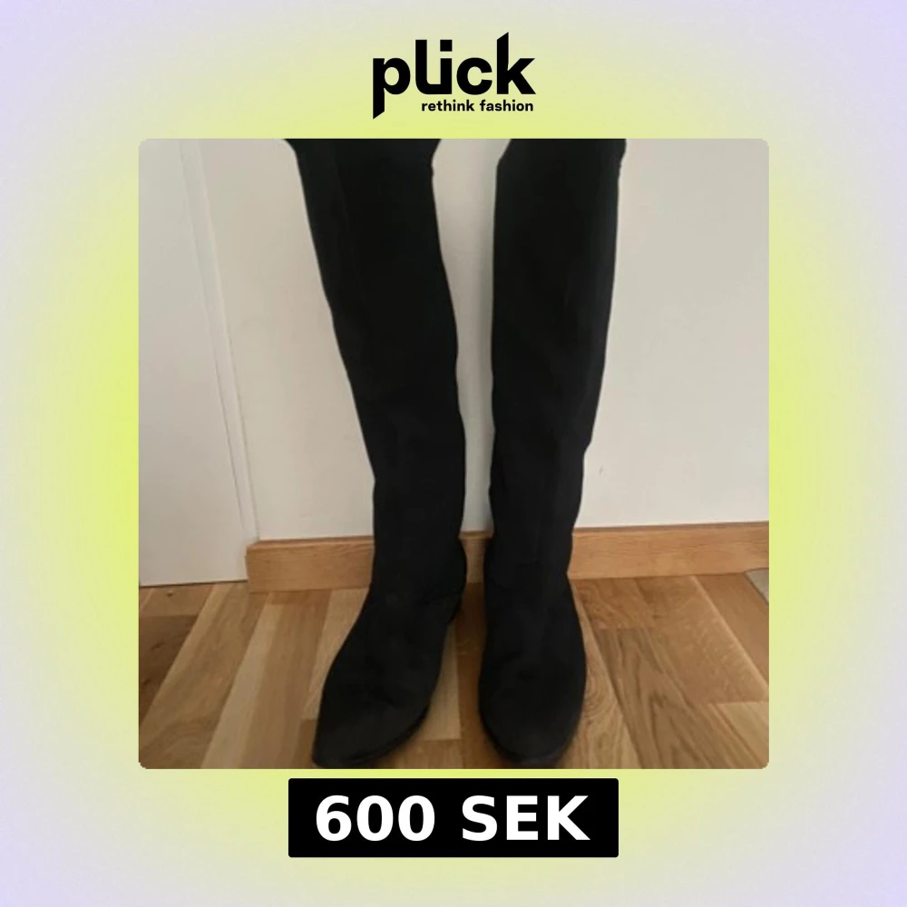 Snygga svarta höga stövlar i mocka med en elegant design. Märke Petit Palmroth, Finland. Perfekta för att ge en stilren look till din outfit. De har en låg klack och en mjuk insida för extra komfort.