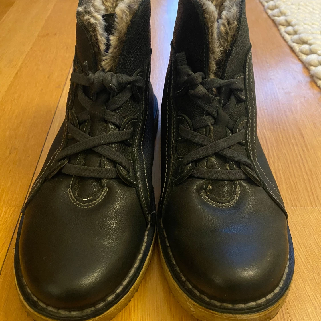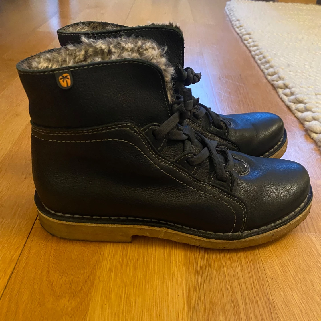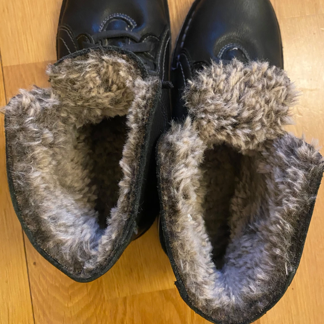 Säljer ett par svarta skinnkängor. Perfekta för kalla dagar med varm och fluffig insida. Skorna har en robust gummisula och en stilren design.