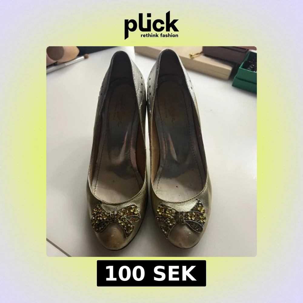 Snygga pumps i guldigt syntetmaterial med rund tå och låg klack. Framtill sitter en glittrig rosett dekorerad med små stenar i gult och silver. Perfekta för dig som vill sticka ut med lite extra bling på fötterna.