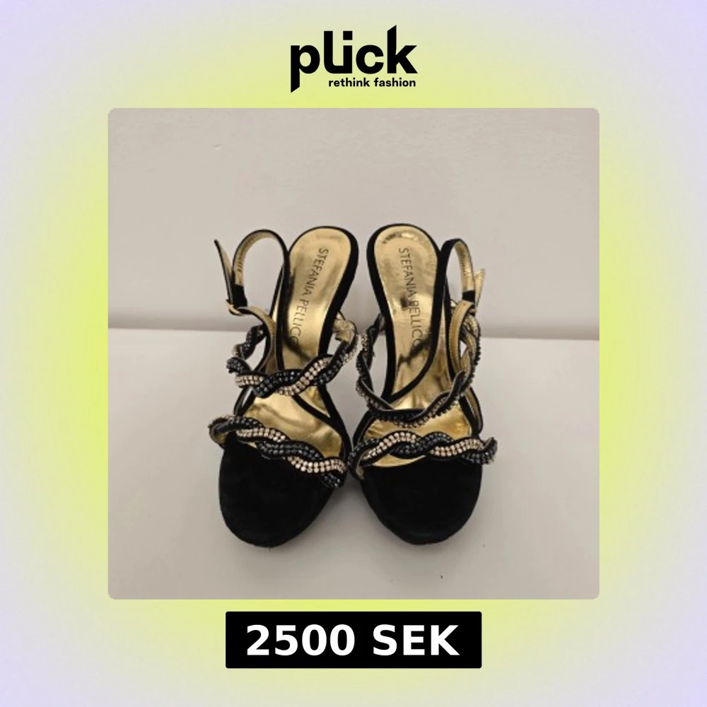 Eleganta pumps i svart mocka med höga guldklackar och glittrande detaljer. Skorna har vågformade remmar dekorerade med svarta och silvriga stenar samt öppen tå och guldfärgad innersula. Perfekta för dig som vill sticka ut.