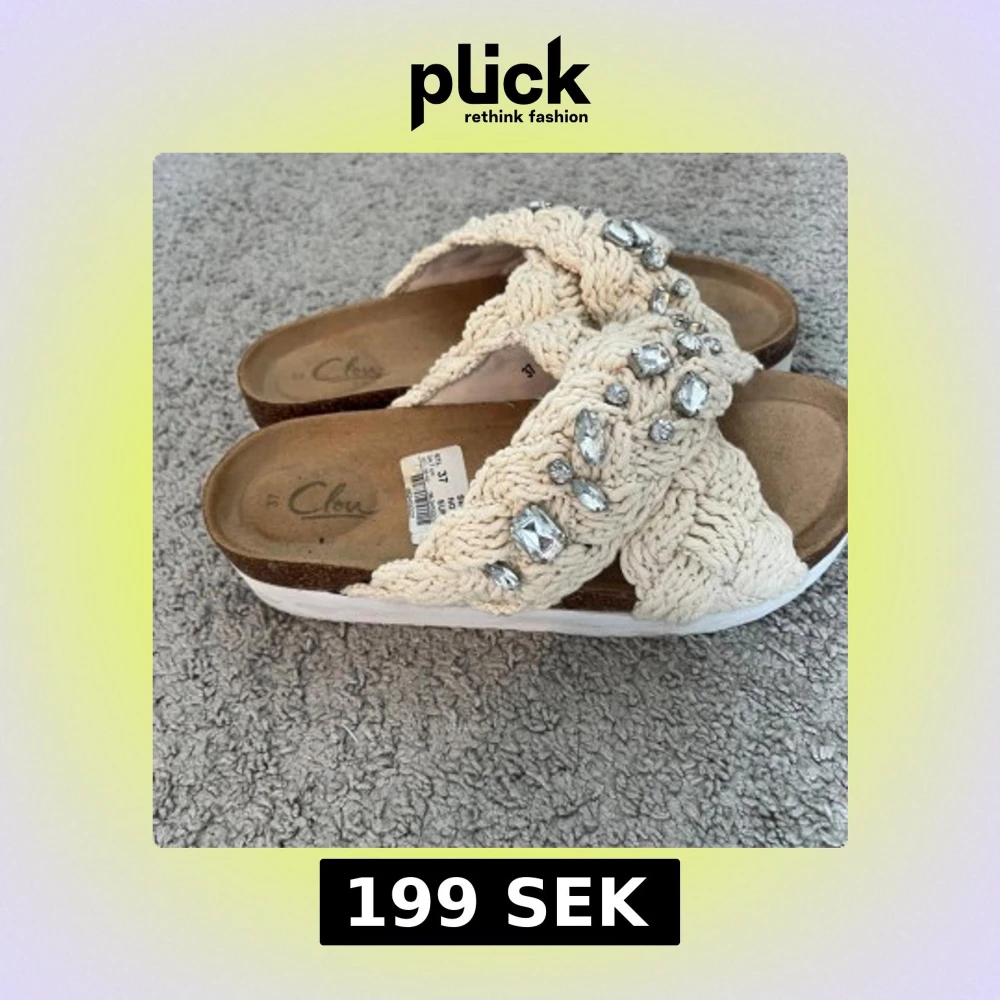 Snygga sandaler från Clou i beige med breda, stickade band i kors och glittrande stenar. Nypris 450kr, Skorna har en platt sula och öppen tå, perfekt för varma dagar✨Använda några fåtal gånger.