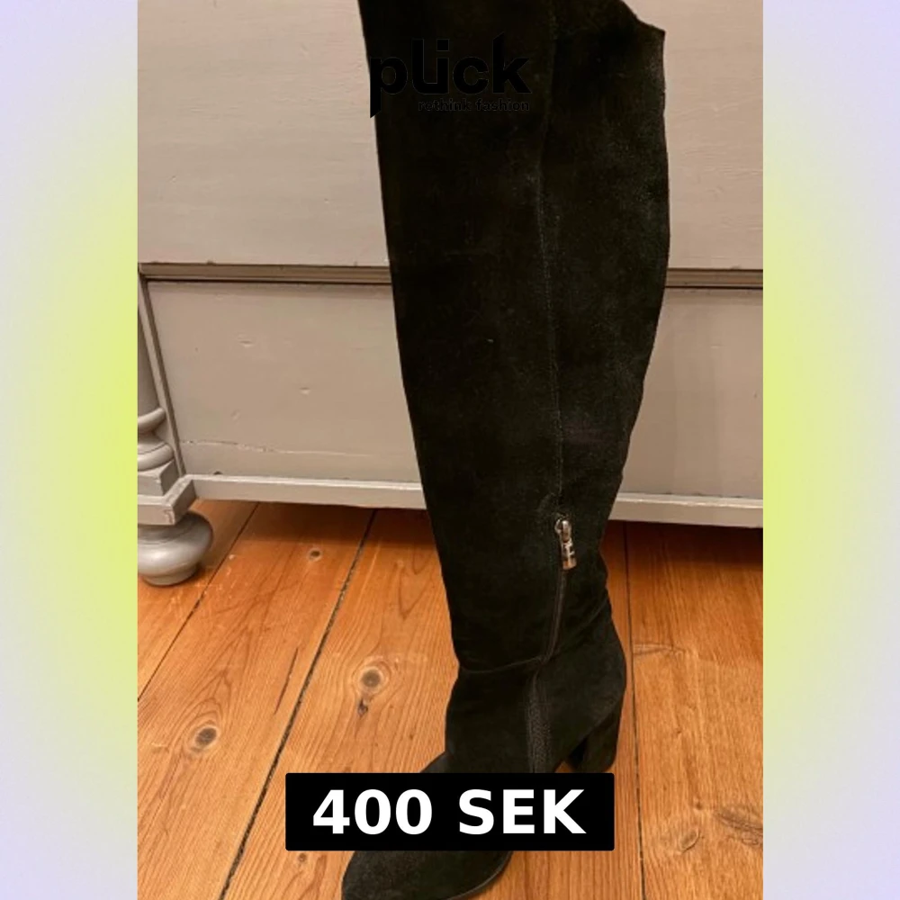 Säljer ett par svarta, höga stövlar i mjuk mocka med spetsig tå och stabil klack. Stövlarna har dragkedja på sidan för enkel påtagning och en stilren, minimalistisk look som passar till många outfits.