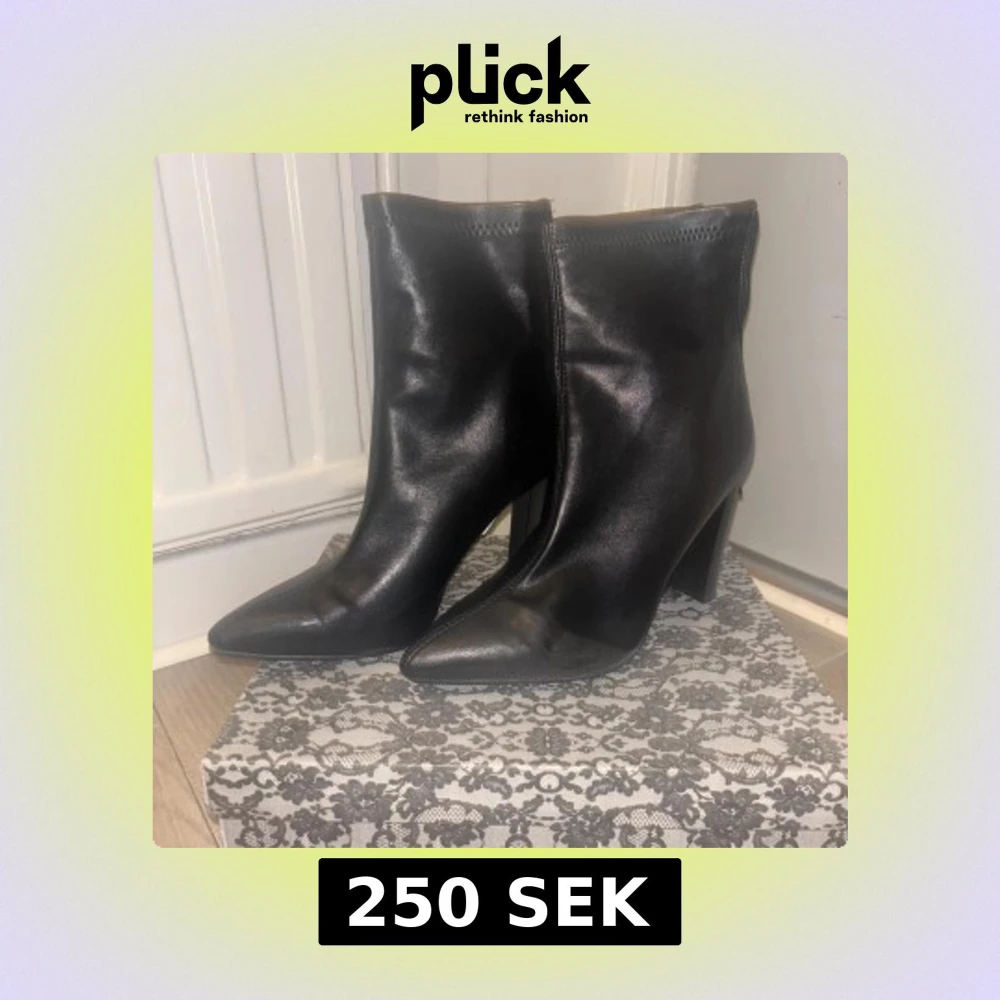 Säljer ett par svarta boots i skinnimitation med hög klack och spetsig tå. Skorna har dragkedja på insidan och en stilren design som passar till många outfits. Perfekta för dig som vill ha en edgy och trendig look.