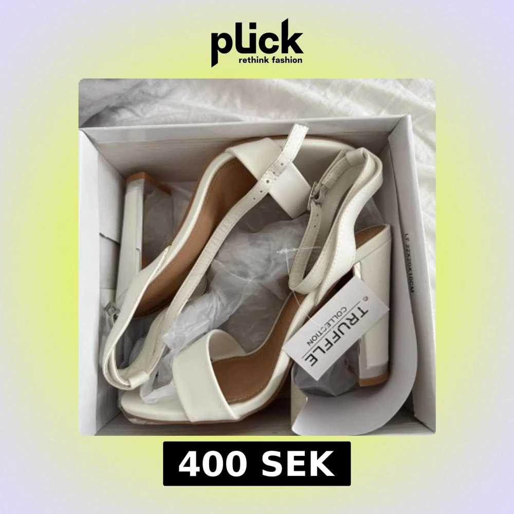 Snygga vita klackar med bred rem över tårna och justerbart spänne runt ankeln. Skorna har blockklack med metallic-detalj på baksidan och är gjorda i syntetmaterial. Perfekta för dig som vill sticka ut med stilrena och trendiga heels.