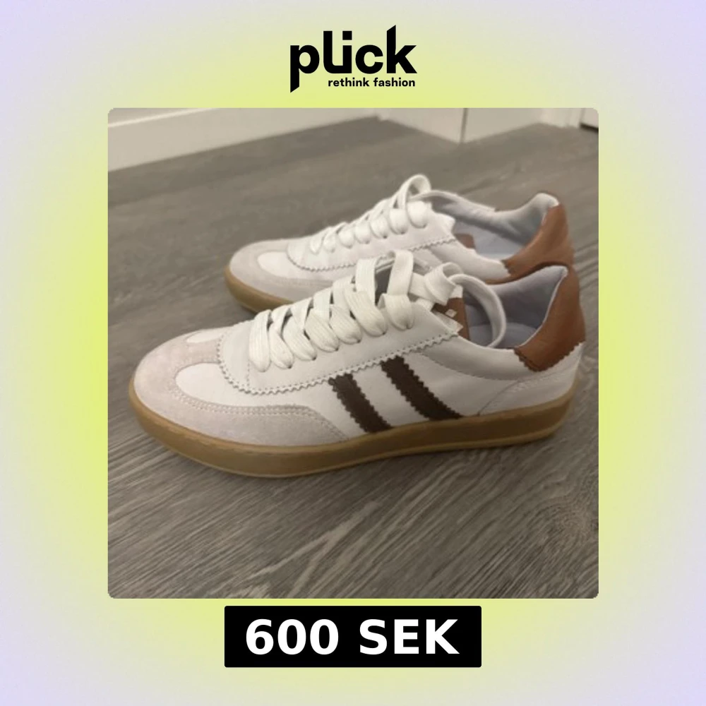 Snygga vita sneakers med bruna detaljer och gummisula. Skorna har två bruna ränder på sidan, brunt parti vid hälen och vit snörning. Ovandelen är i en mix av mocka och skinn, vilket ger en stilren och fräsch look. Perfekta för dig som gillar klassisk streetstyle. Säljer ett par skor som jag endast har använt 1 gång och de är inprincip i nyskick bortsett från det som syns i bild 2. Skriv för fler bilder eller frågor