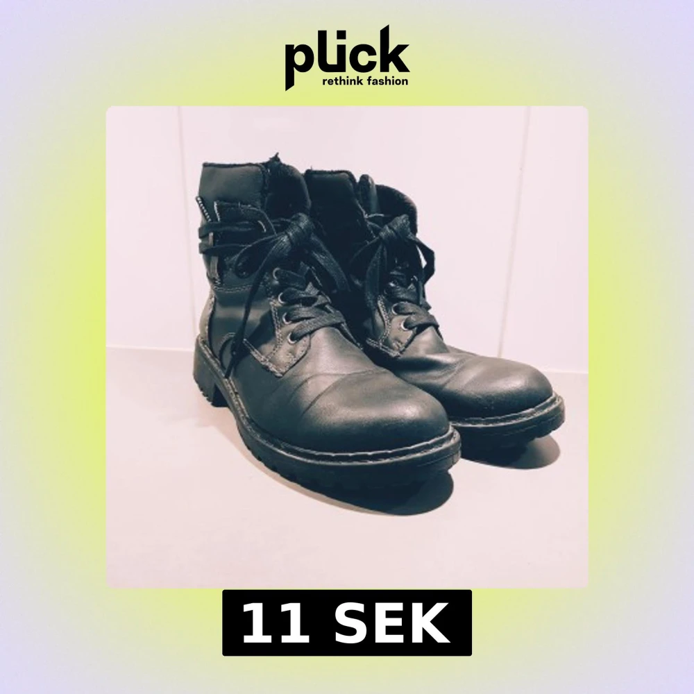 Tuffa svarta kängor i skinn med grov sula och snörning framtill. Snygga detaljer med synliga sömmar och metallnitar på sidan. Perfekta för dig som gillar en edgy stil och vill ha skor som funkar hela hösten och vintern. Ena hällan vid skosnörena har gått sönder (se bild) men inget som stör funktionen & en liten reva fram men inga hål