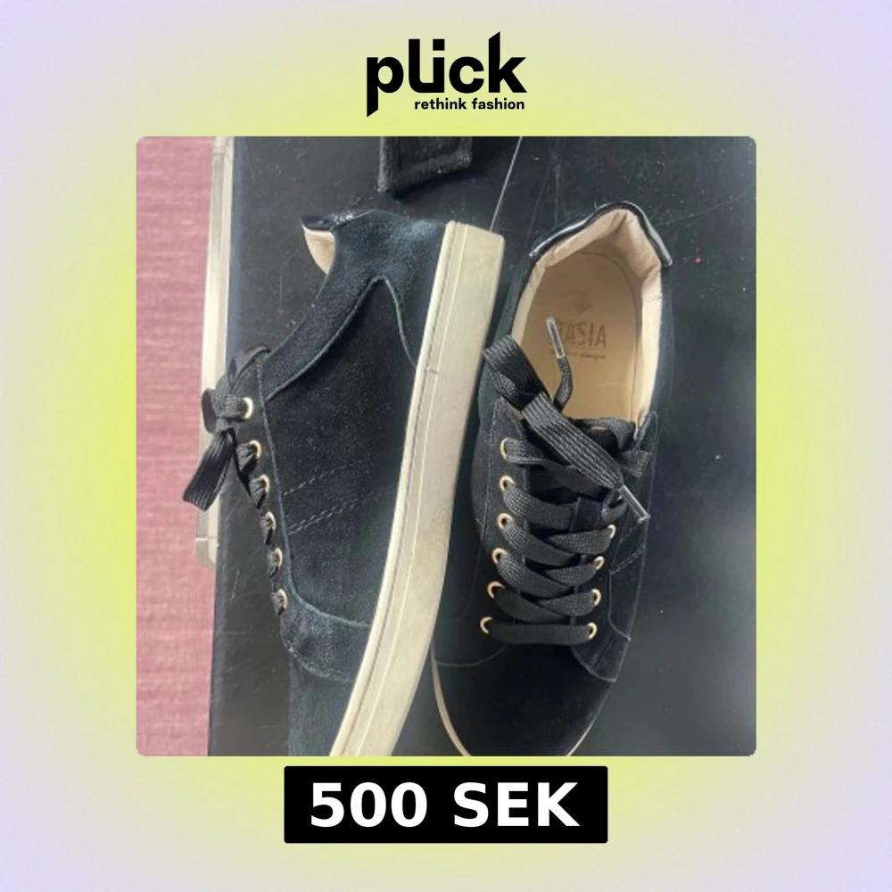 Snygga svarta sneakers från Dasia i mjuk mocka med vita sulor och svarta snören. Skorna har guldfärgade öljetter och en klassisk rund tå. Insidan är ljusbeige och bakkappan har en glansig detalj. Perfekta för en stilren och trendig look.