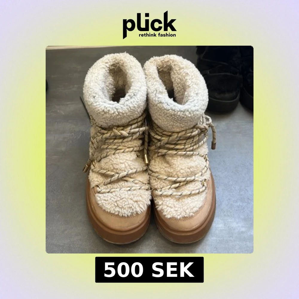 Vinterskor i beige med fluffigt teddyfoder och grov plattformssula. Snygga snören med svarta detaljer och små nitar på sidan. Perfekta för kalla dagar och har en rund tå. Märke syns tydligt på hälen. de är från beska storlek 37 typ helt oanvända jättesnygga till vintern