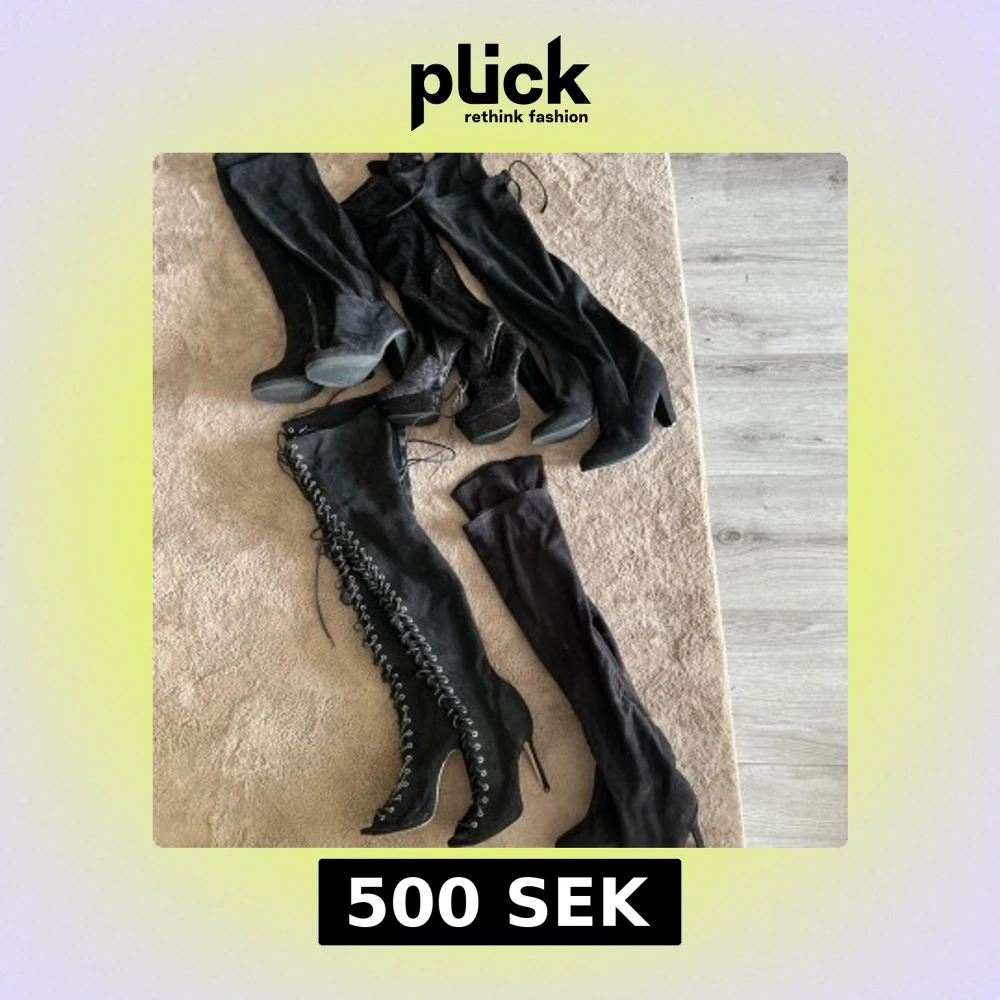 Fem par svarta lårhöga boots med klack. Ett par har snörning framtill och spetsig tå, de andra har slät design och rund tå. Alla är i mocka-liknande material och har höga klackar. Perfekta för att lyfta din outfit.