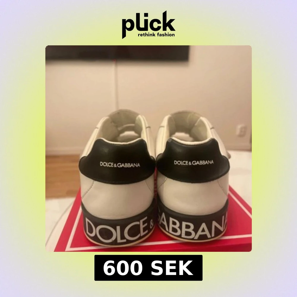 Säljer ett par vita sneakers från Dolce & Gabbana med svarta detaljer och tydlig logga både bak och på remmarna. Skorna har kardborreband och är tillverkade i skinn med en platt sula. Perfekta för dig som gillar stilrena och exklusiva sneakers.