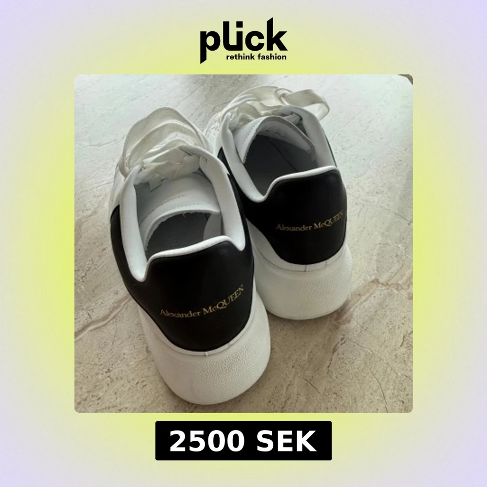 Stilrena vita sneakers från Alexander McQueen med svart hälparti och guldfärgad logga. Skorna har breda vita snören, rund tå och en chunky platt sula med unikt mönster undertill. Tillverkade i skinn för en lyxig känsla och passar perfekt till streetwear. Tror dom är äkta