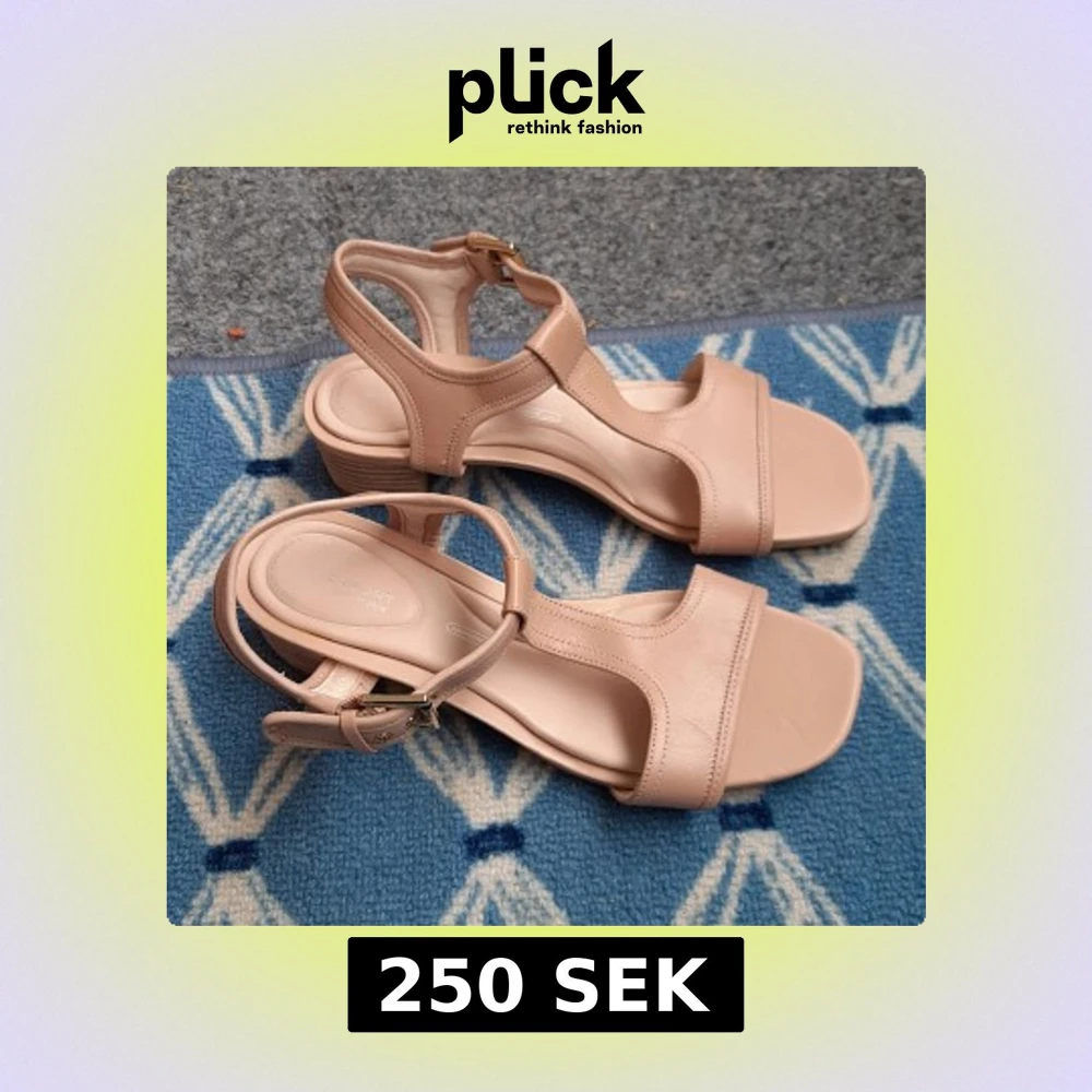 Säljer ett par stilrena beige sandaler från Rockport med låg klack och justerbart spänne vid ankeln. Skorna har öppen tå och platt sula framtill, perfekt för varmare dagar. Skor är helt nya.