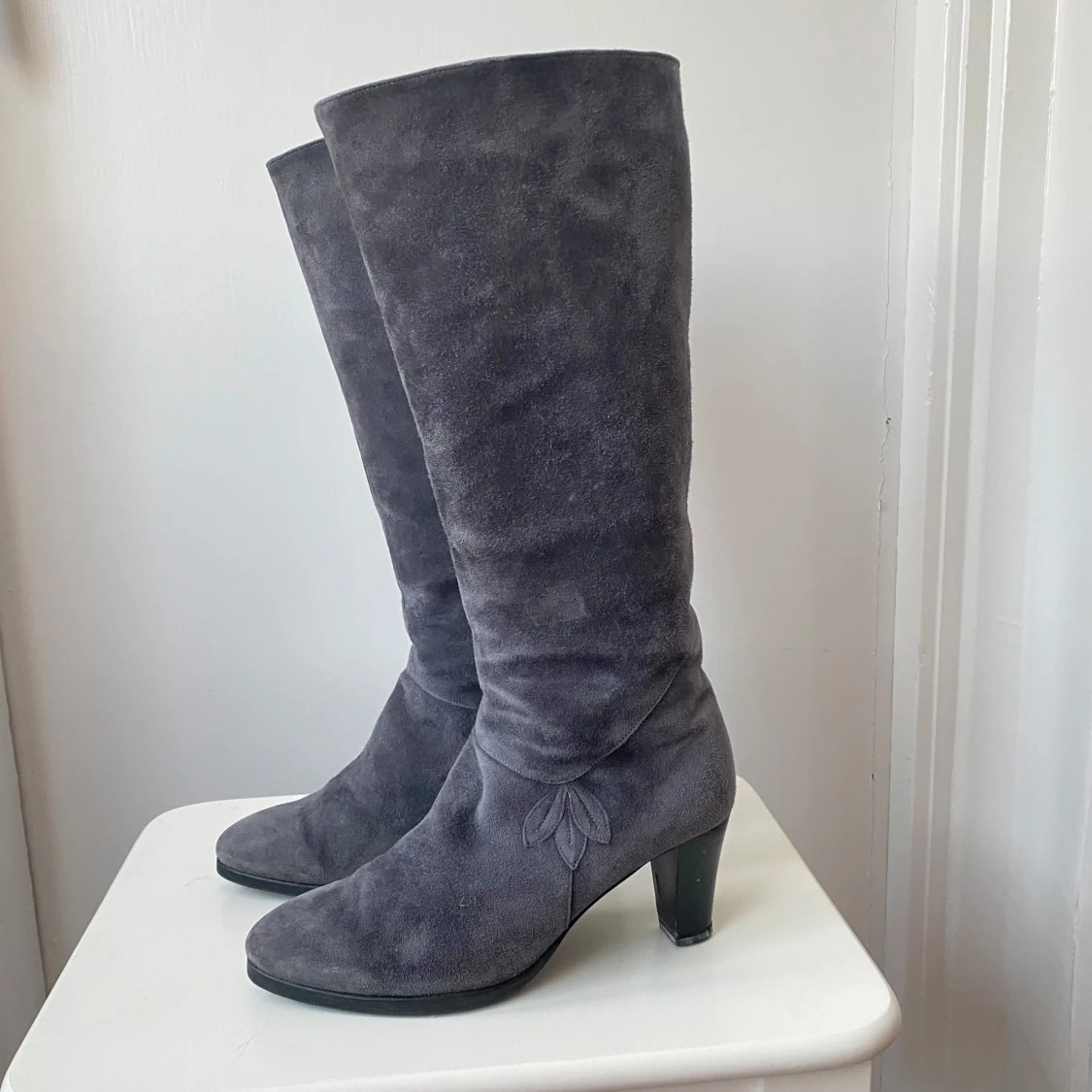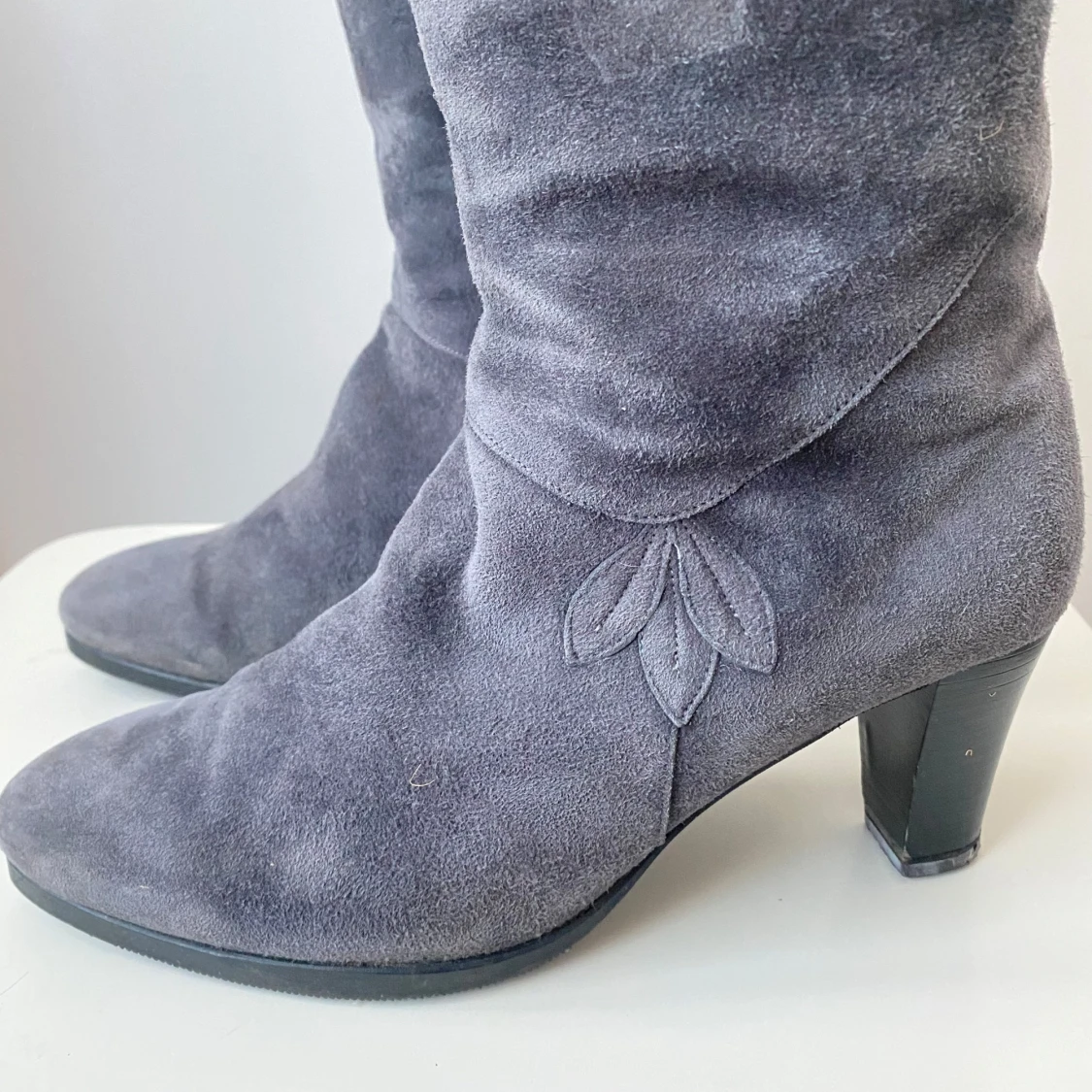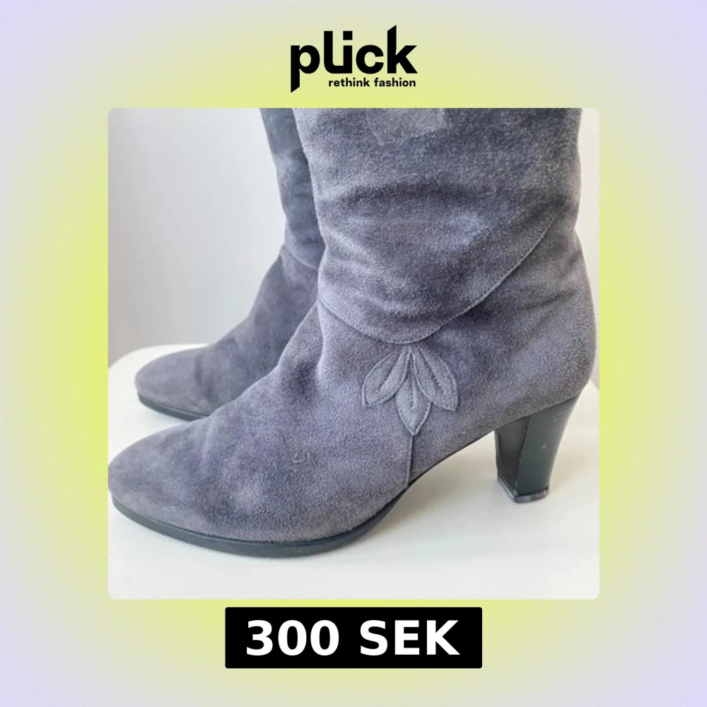Snygga grå stövlar i mocka från juhani palmroth med medelhög klack och dekorativt bladmönster på sidan. Stövlarna har rund tå, dragkedja på insidan och en klassisk siluett som passar till många outfits.