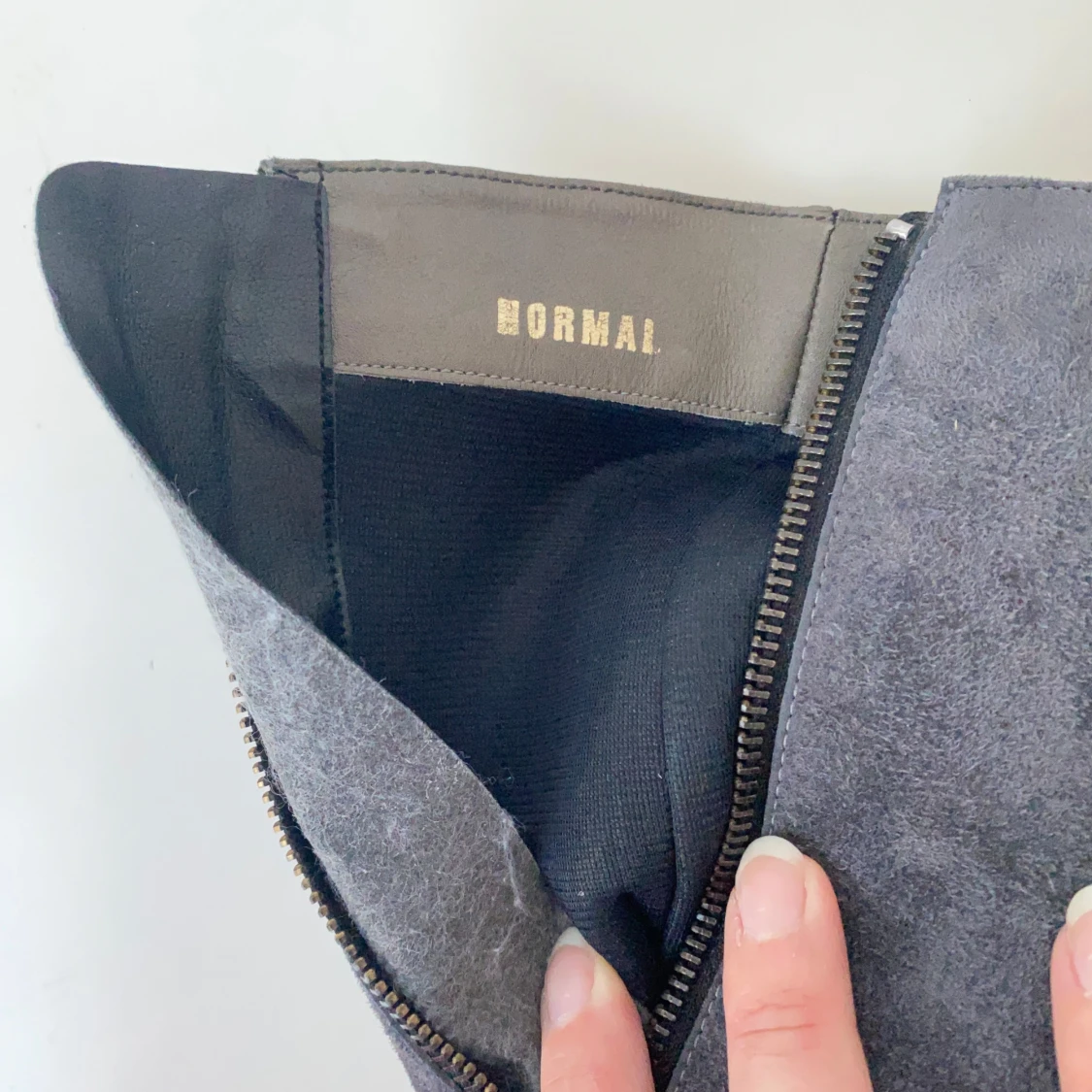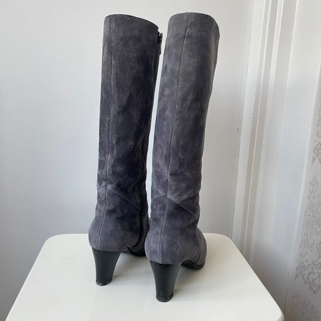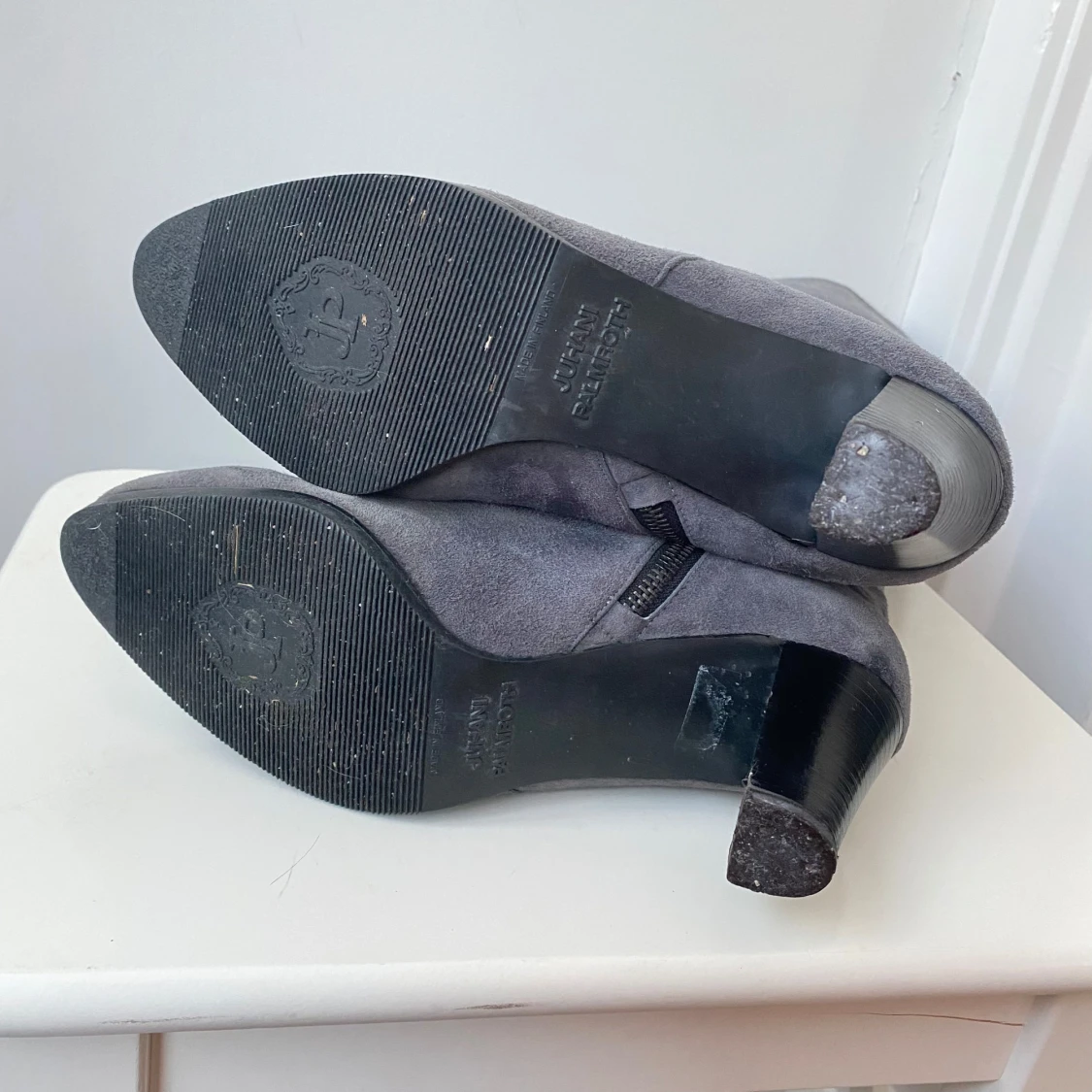Snygga grå stövlar i mocka från juhani palmroth med medelhög klack och dekorativt bladmönster på sidan. Stövlarna har rund tå, dragkedja på insidan och en klassisk siluett som passar till många outfits.
