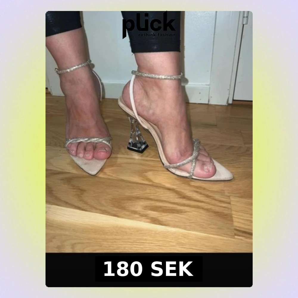 Säljer ett par snygga sandaler i beige mocka med spetsig tå och glittriga remmar över foten och runt ankeln. Klacken är transparent och har en unik form som verkligen sticker ut. Perfekt för dig som vill ha något extra till outfiten.