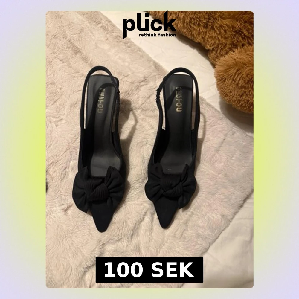 Säljer ett par eleganta svarta pumps med spetsig tå och låg klack. Skorna har en stor tygrosett framtill och öppen häl med rem. Materialet är troligtvis syntet eller textil, vilket ger en mjuk känsla och stilren look.