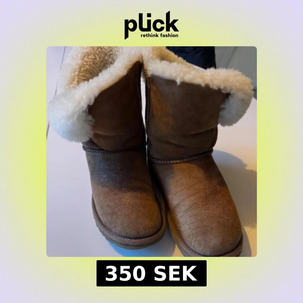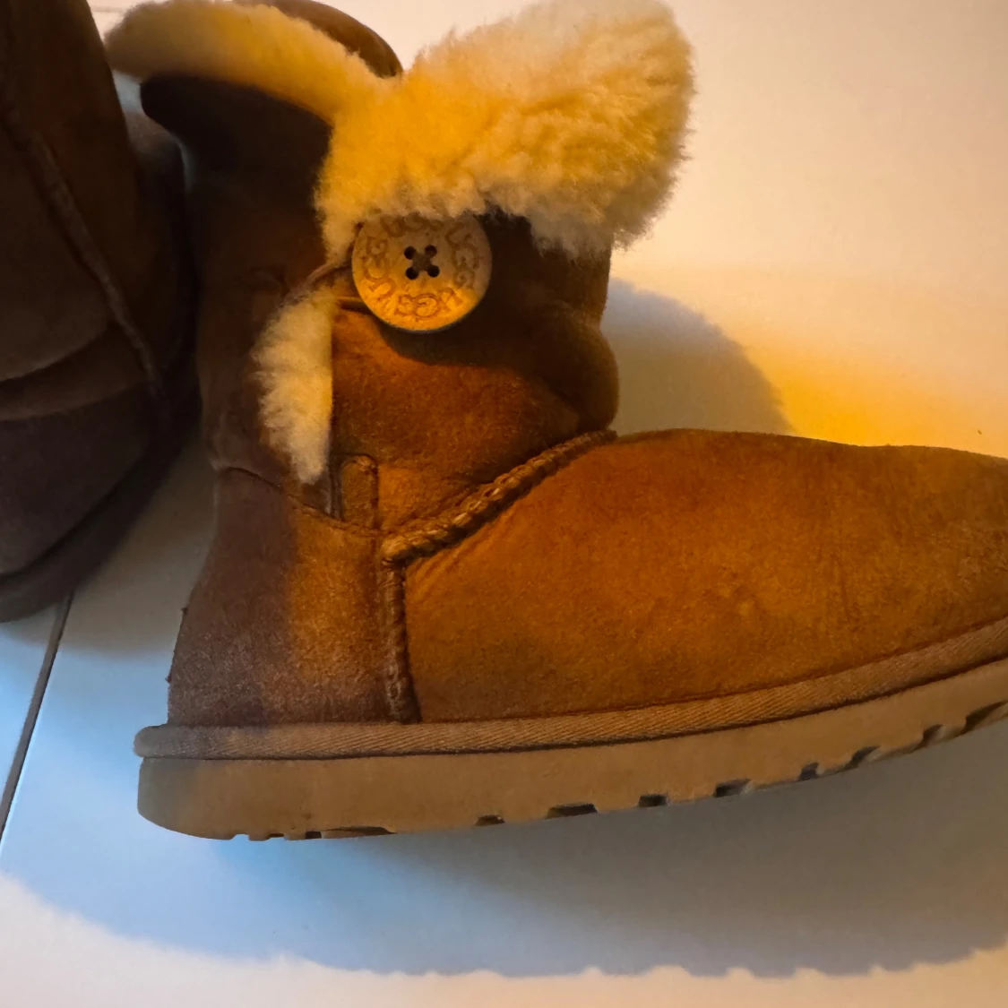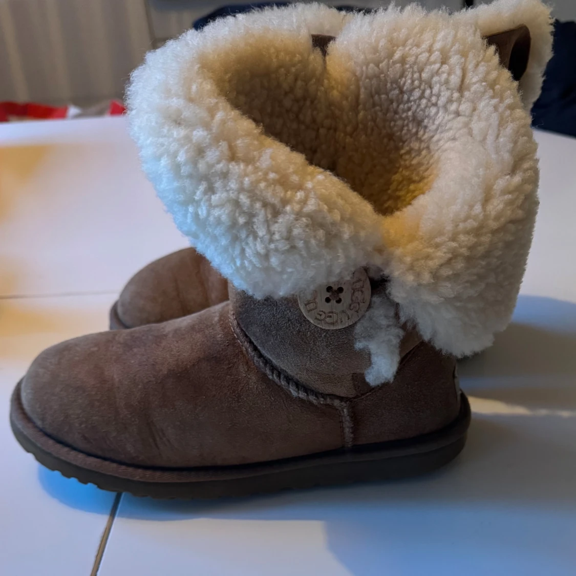 Mysiga bruna UGG boots med fluffigt vitt fårskinnsfoder och dekorativ knapp på sidan. Gjorda i mjuk mocka med platt sula och rund tå. Perfekta för kalla dagar när du vill hålla fötterna varma och sköna.
