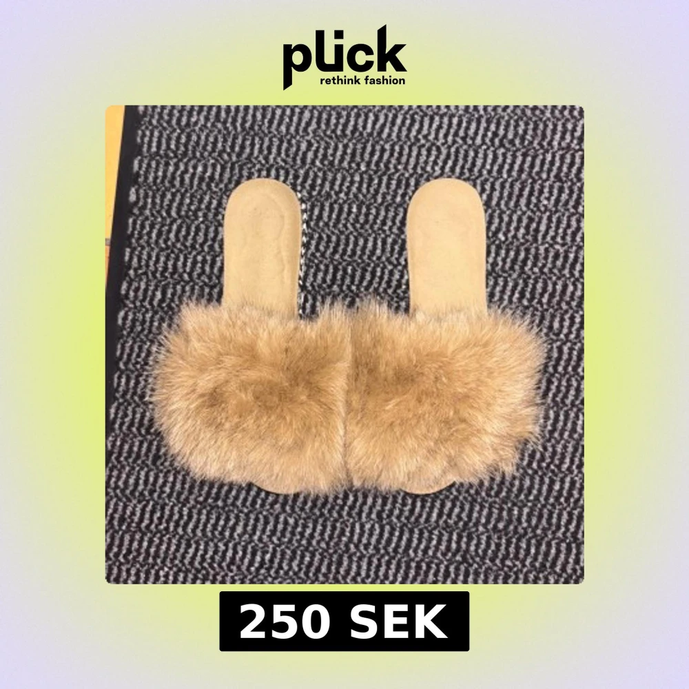 Säljer ett par sandaler med breda, fluffiga remmar i beige päls och en platt sula med dekorativa detaljer längs kanten. Perfekt för dig som vill ha något extra mjukt och trendigt på fötterna. Snyggt att matcha med jeans eller shorts.