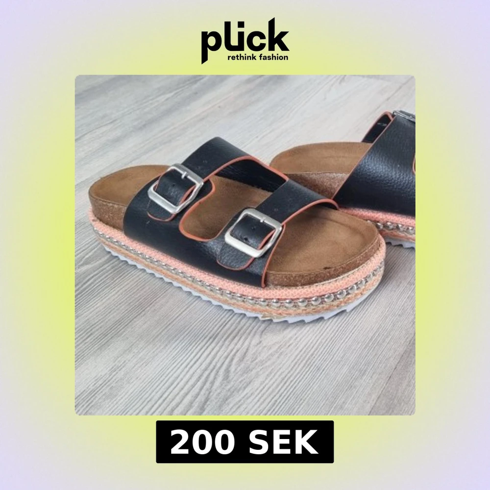 Snygga sandaler med svarta remmar i skinnimitation och dubbla silverspännen. Platåsulan har detaljer i orange, jute och silvriga nitar samt vit räfflad undersida. Perfekta för en trendig sommarlook.