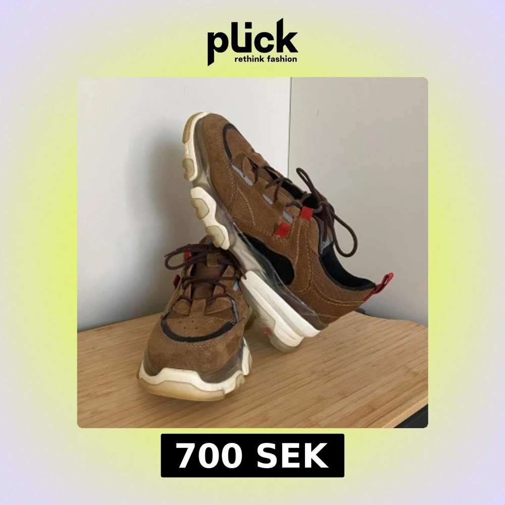 Säljer ett par chunky sneakers i brunt med mocka och svarta detaljer. Skorna har kraftig vit sula, röda dragflikar och snörning. Priset ingår frakt.
