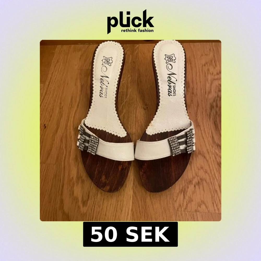 Snygga sandaler från Nelvas med vit rem i skinn och glittriga strassdetaljer framtill. Sulan är i mörkt trä och klacken är smal i metall med coola nitar. Perfekt för dig som vill sticka ut med en unik och trendig look.