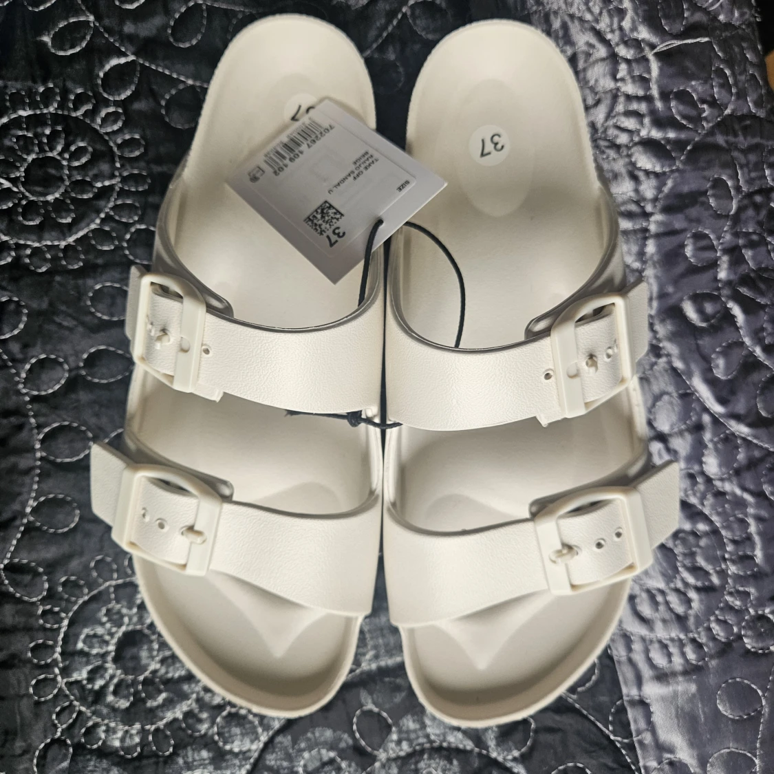 Snygga beiga sandaler med två breda remmar och justerbara spännen. Platt sula och öppen tå gör dem perfekta för varma dagar. Tillverkade i syntetmaterial och passar dig som gillar enkel och stilren design.