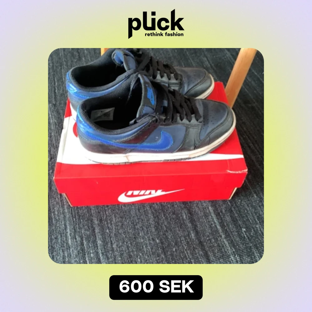 Hej säljer ett par nike dunk midnight navy eftersom de är för små. Skick 6 av 10 är slitningar i lädret. Köpte på pardon my kicks har kvitto och box som ingår. Storlek 38,5. Tvättar dem inann dem skickas ☺️