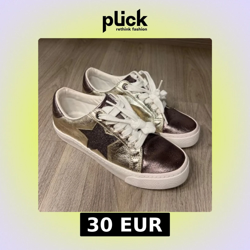 Snygga sneakers i glittrigt guld och brunt från Next i storlek 38,5. Slutsålda på zalando. Skorna har en stjärndetalj på sidan och vita snören. Skorna har endast andvänts en gång!!