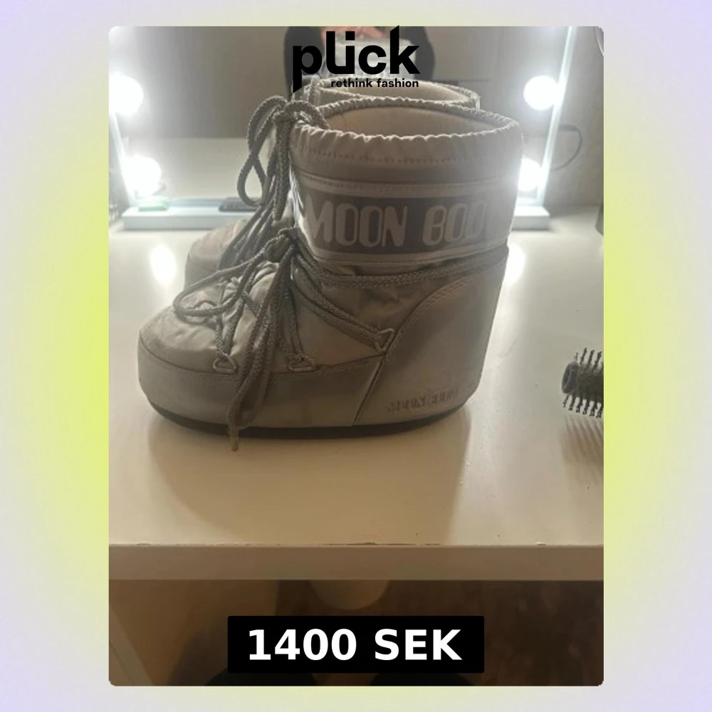 Säljer ett par klassiska silvriga Moon Boots med snörning och rund tå. Skorna har en hög och vadderad design som ger en futuristisk vibe och är perfekta för vintern. De är tillverkade i syntetmaterial och har en platt sula för extra komfort. Pris kan diskuteras