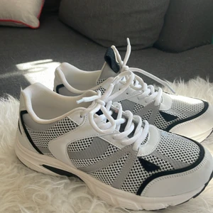 Chunky vita sneakers från NOKWOL - Säljer ett par chunky vita sneakers från NOKWOL med svartvitrandiga snören och tjock sula. Skorna har cool streetstyle-vibe. Dom behöver bara tvättas därav säljer billigt.