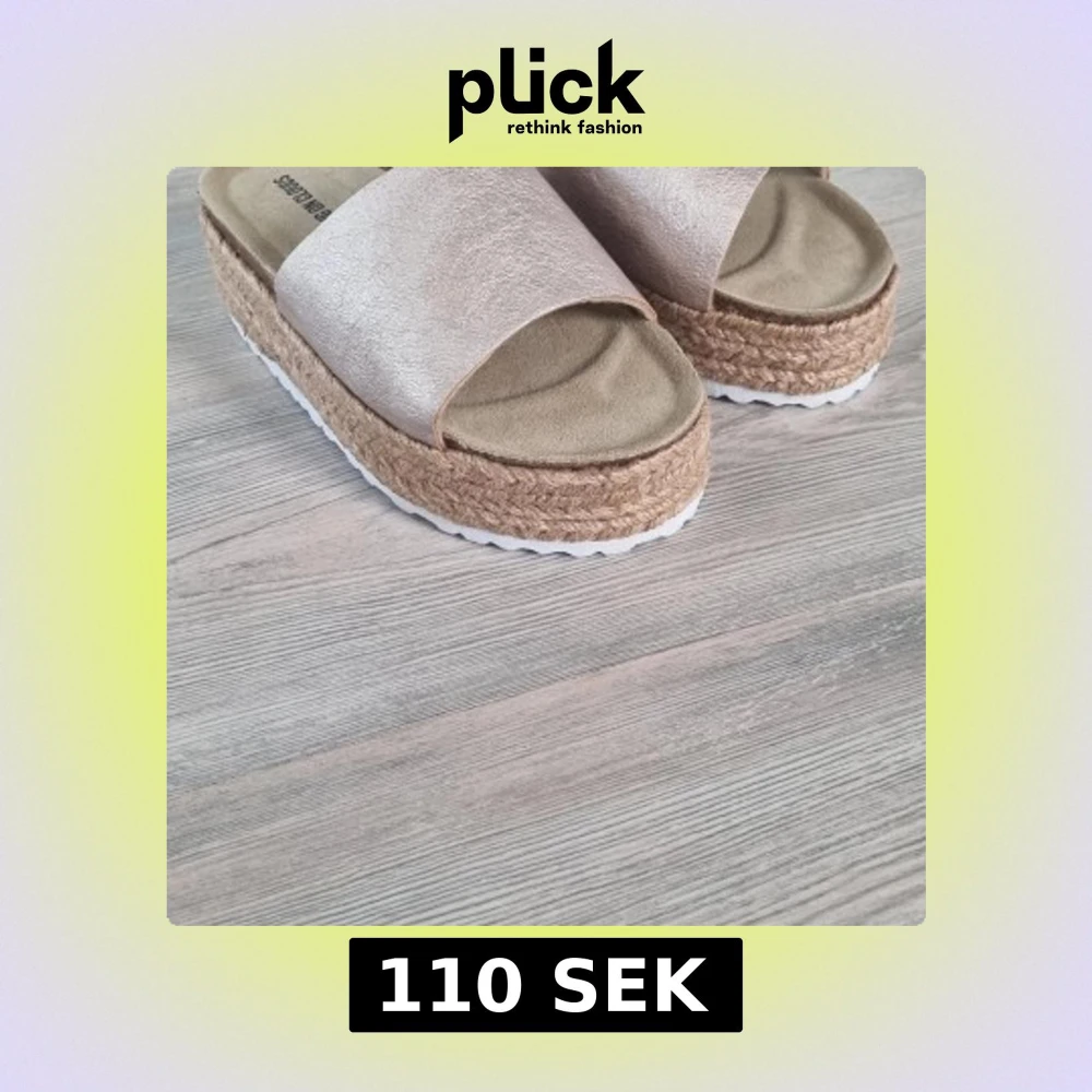 Snygga platåsandaler i ljusrosa metallic med bred rem i skinn och mjuk innersula. Sulan är flätad i jute-look och har en vit räfflad undersida för extra grepp. Perfekta för sommaren och ger en trendig touch till din outfit.