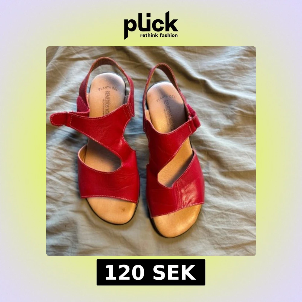 Snygga röda sandaler i mjukt skinn med coola utskärningar och justerbar kardborreknäppning. De har öppen tå, platt sula och svart yttersula. Perfekta för varma dagar när du vill ha både stil och komfort.