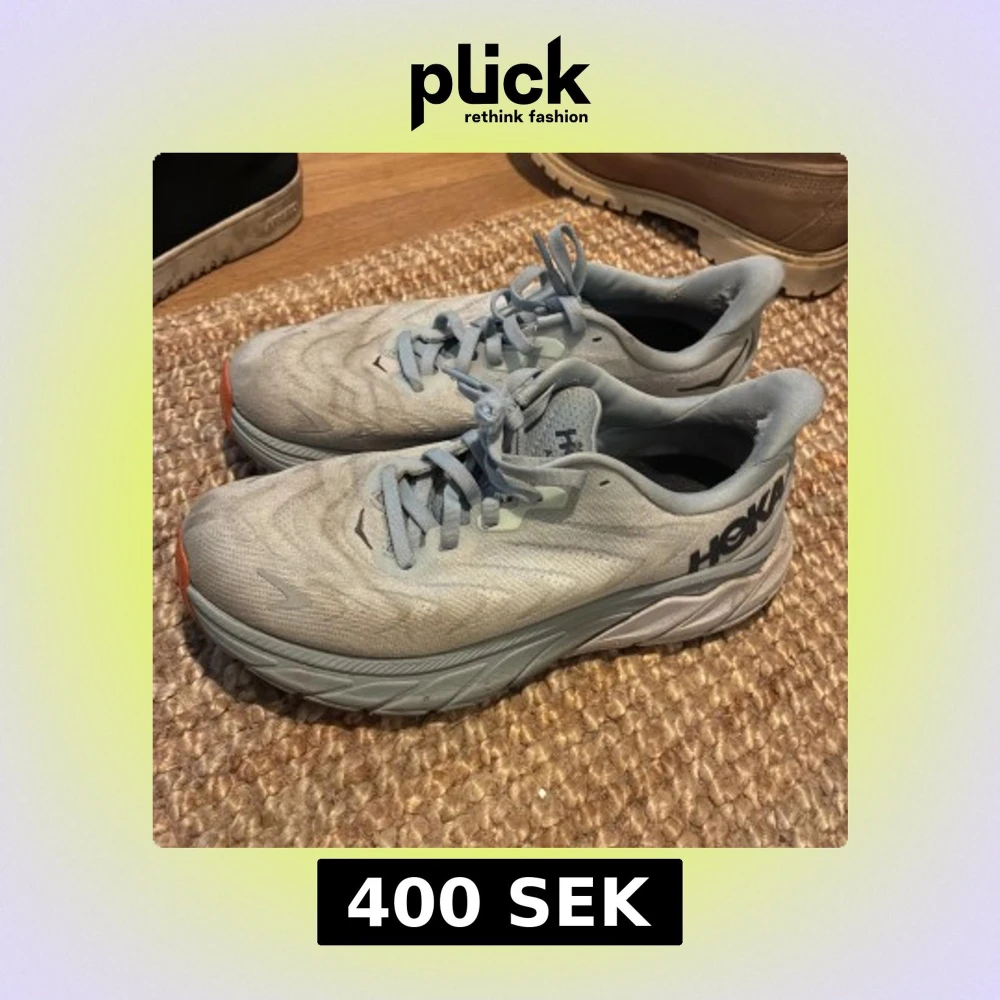 Säljer ett par ljusblå sneakers från Hoka. Modell Arachi 6 med tjock sula och snörning. Skorna har en sportig design med diskreta reflexdetaljer och orange detalj vid tån. Perfekta för träning eller vardagsbruk.