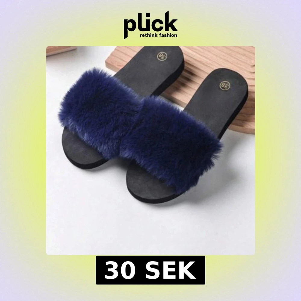 Snygga svarta sandaler med bred rem i mörkblå, fluffig pälsimitation. Platt sula och öppen tå gör dem perfekta för varma dagar. Ger en trendig och mysig vibe till din outfit.