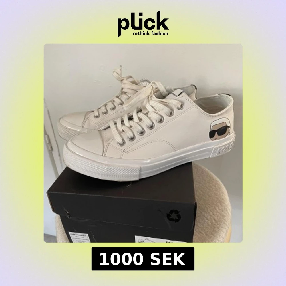 Snygga vita sneakers från Karl Lagerfeld med ikonisk design på sidan. Skorna har klassisk snörning och en stilren look som passar perfekt till vardags. De är tillverkade i syntetmaterial och har en bekväm passform. Använda vid ett tillfälle.