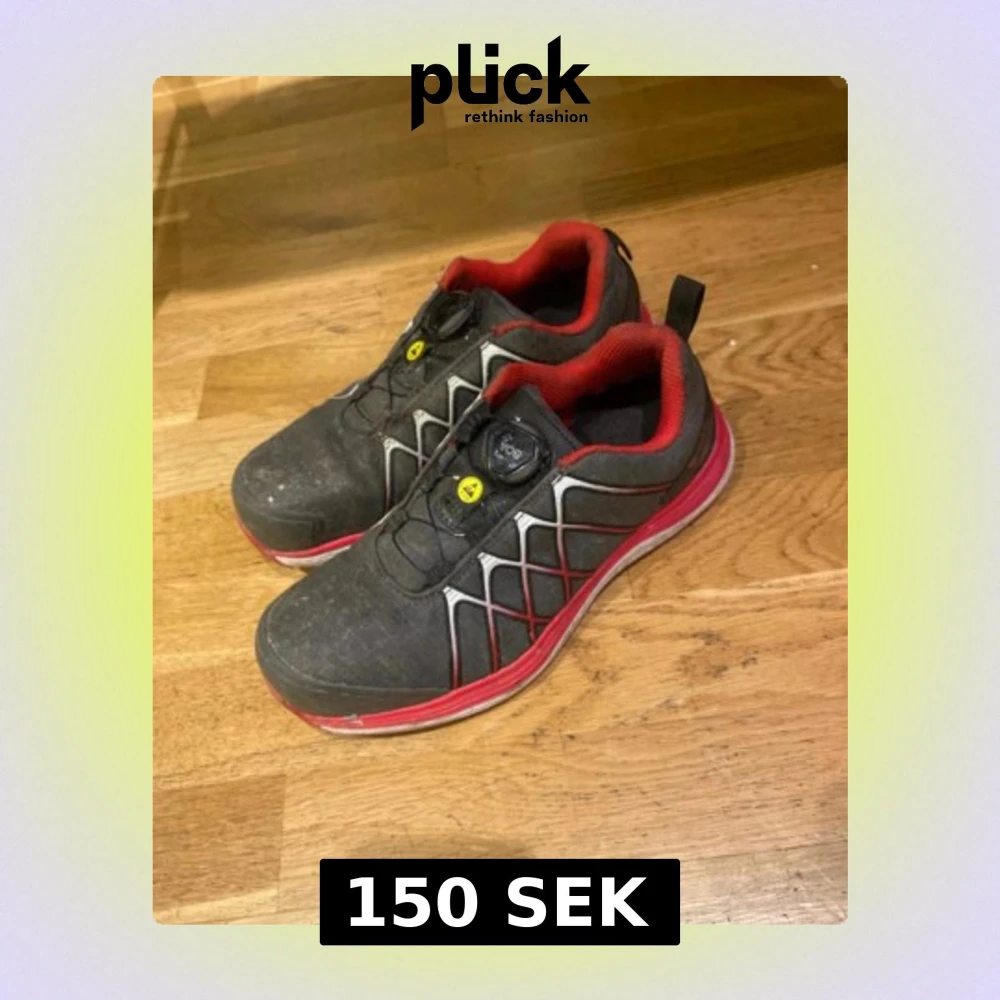 Säljer ett par svarta Stålhetta arbetsskor från Gesto med röda och vita detaljer. Skorna har BOA-snörning för enkel justering och en sportig look. Ovandelen är i syntetmaterial med mönstrade linjer och röd insida. Perfekta för dig som gillar stilrena och funktionella skor. Skorna är väldigt använda som man ser men går enkelt att rengöra med en tvätt. Storlek 38