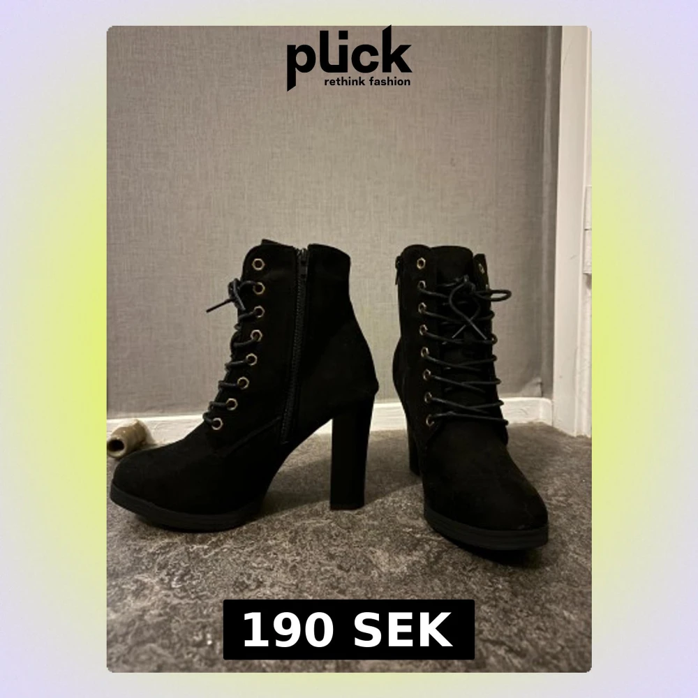 Säljer ett par svarta stövletter i mocka-look med höga blockklackar. Skorna har snörning framtill med guldfärgade öljetter och dragkedja på sidan för enkel påtagning. Aldrig använt, ordinarie pris 270kr 🌸Öppen för förhandling 🩷