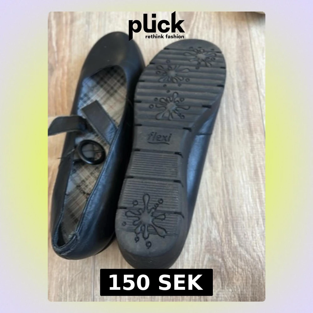 Säljer ett par svarta Mary Jane-inspirerade ballerinaskor från Flexi med bred plattformssula och rund tå. Skorna har ett justerbart spänne och insida med rutigt foder. Tillverkade i syntetmaterial med robust sula för extra komfort.