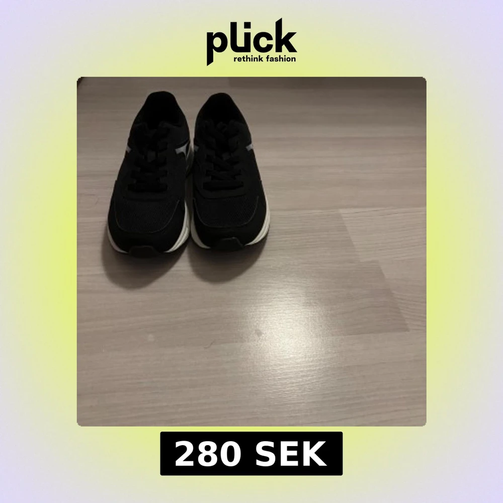 Säljer ett par svarta sneakers med vit sula och snygga vita detaljer på sidan. Skorna har snörning och rund tå, tillverkade i syntetmaterial med mesh för extra komfort. Perfekta för dig som gillar stilrena och sportiga skor.