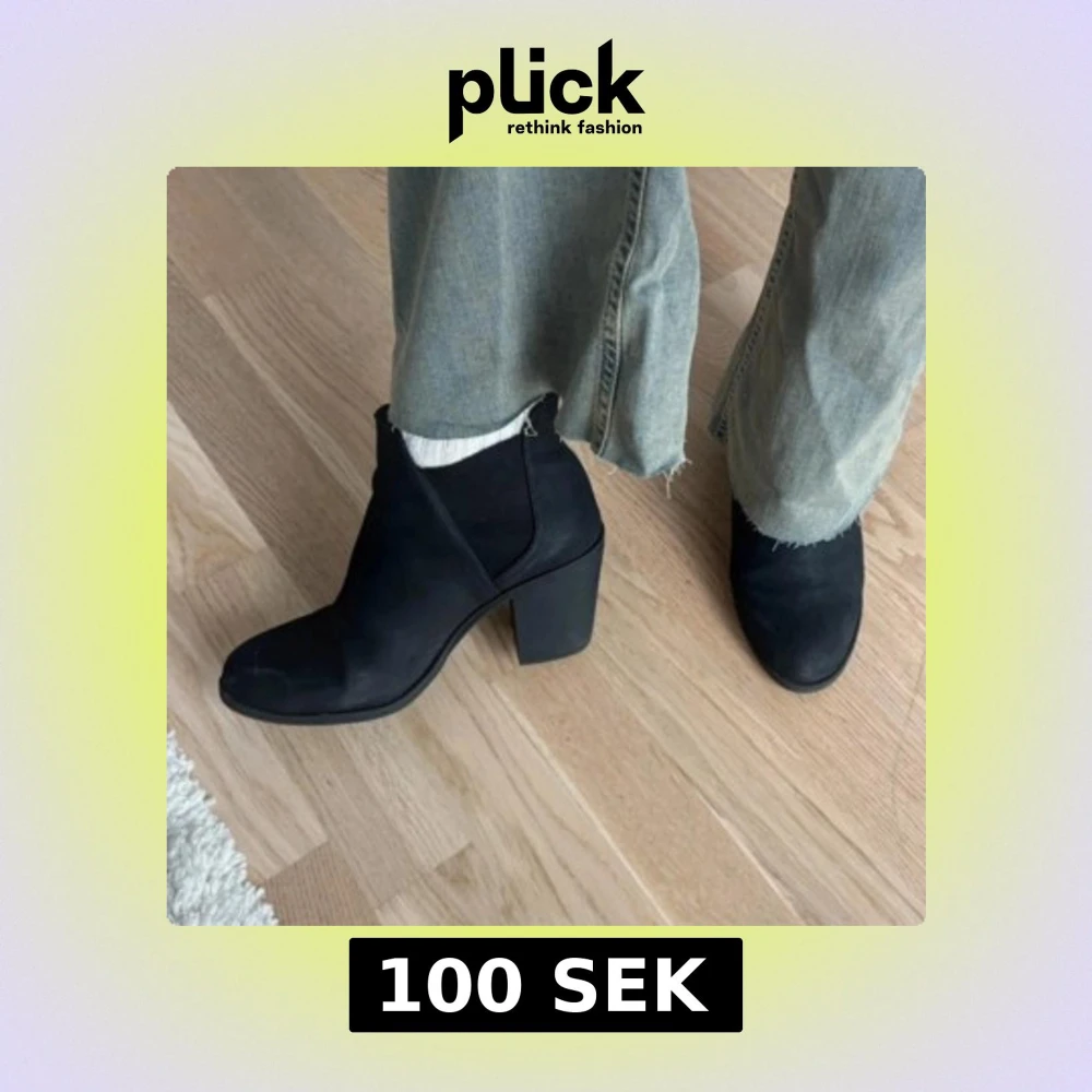 Säljer ett par svarta stövletter med rund tå och stabil hög klack. Skorna har en stilren design och är tillverkade i mocka, vilket ger dem en mjuk och matt finish. Perfekta att matcha med jeans eller kjol för en cool look.