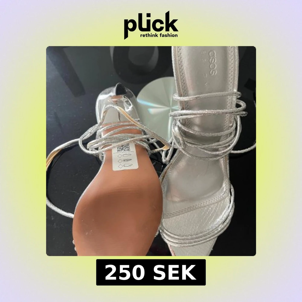 Säljer ett par silvriga klackskor från ASOS Design med spetsig tå och tunna remmar som snöras runt vristen. Skorna har hög klack och är tillverkade i syntetmaterial med metallicfinish. Perfekta för att sticka ut och ge en futuristisk vibe till din outfit.