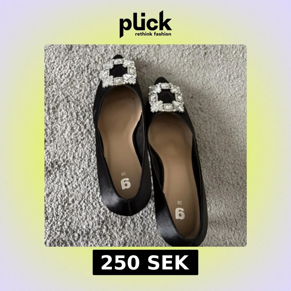 Eleganta svarta pumps med spetsig tå och låg klack. Skorna är tillverkade i satinliknande material och har en stor dekorativ pärlbesatt brosch framtill som ger extra lyxig känsla. Perfekt för dig som vill sticka ut med stilrena detaljer.