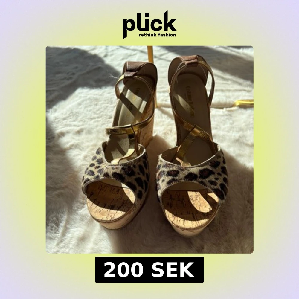Snygga kilklackar med leopardmönster och guldfärgade remmar. Skorna har en öppen tå och en hög korkplattform som ger extra höjd. Perfekta för att sätta en trendig touch på din outfit.