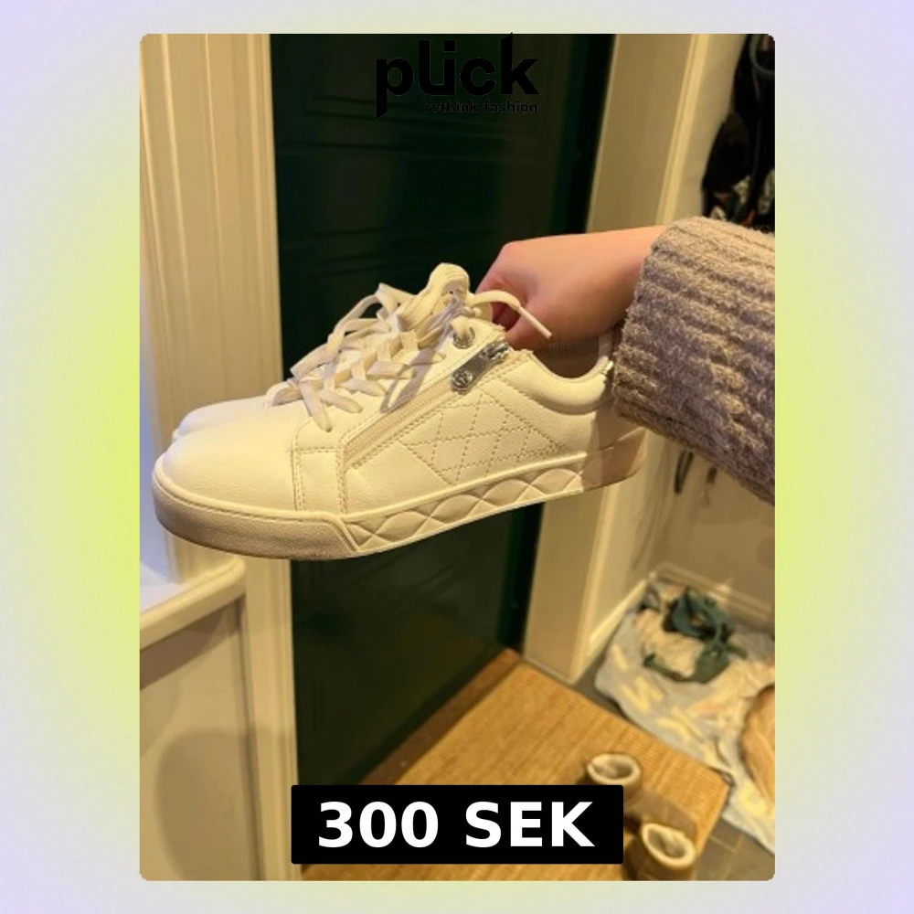 Säljer ett par vita sneakers från Ceci Comfort i storlek 38. Skorna har quiltade detaljer på sidan, silvriga hälpartier och dragkedja vid snörningen. Snygg och enkel design med platt sula och rund tå. Perfekta till jeans eller kjol!