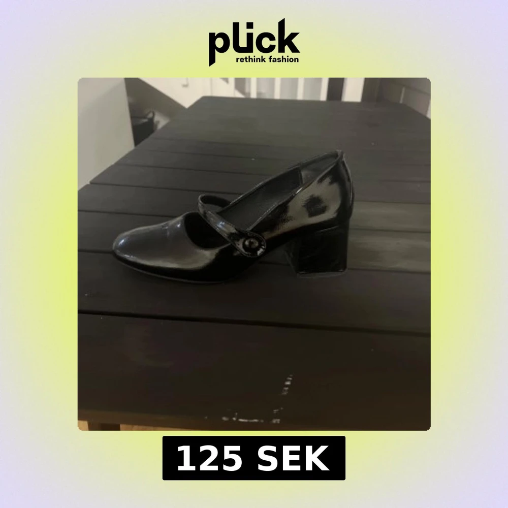 Säljer en svart, glansig Mary Jane-sko med bred klack och rund tå. Snygg rem med knappdetalj över foten. Perfekt för dig som vill ha en klassisk och stilren sko med lite retrovibbar.