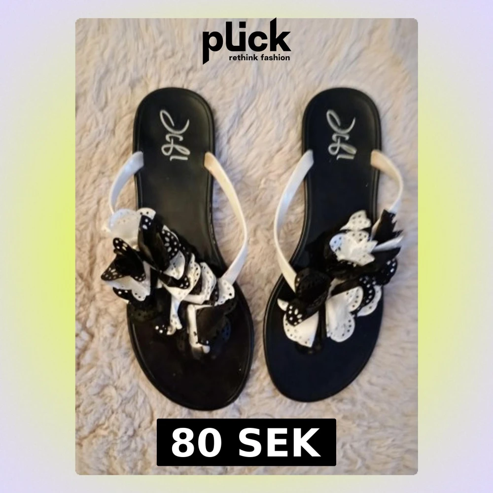 Säljer ett par sandaler från JGL med svart sula och vita remmar. Dekorerade med stora blommor i svart och vitt med prickigt mönster på ovansidan. Perfekta för dig som gillar att sticka ut med coola detaljer och kontrasterande färger.