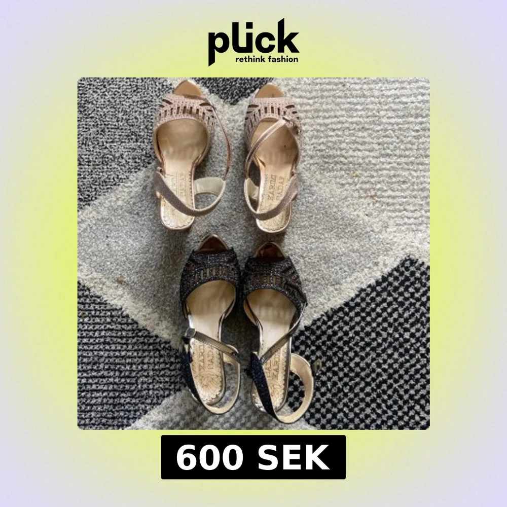Två par sandaler från Karimi Sadaf med glittriga detaljer, öppen tå och bred klack. Ett par är i champagnefärgat och ett par i svart, båda med justerbar rem runt vristen och dekorativa utskärningar framtill. Perfekta för dig som gillar att sticka ut. Dom ljusa har storlek 38 och dom svarta Storlek 38