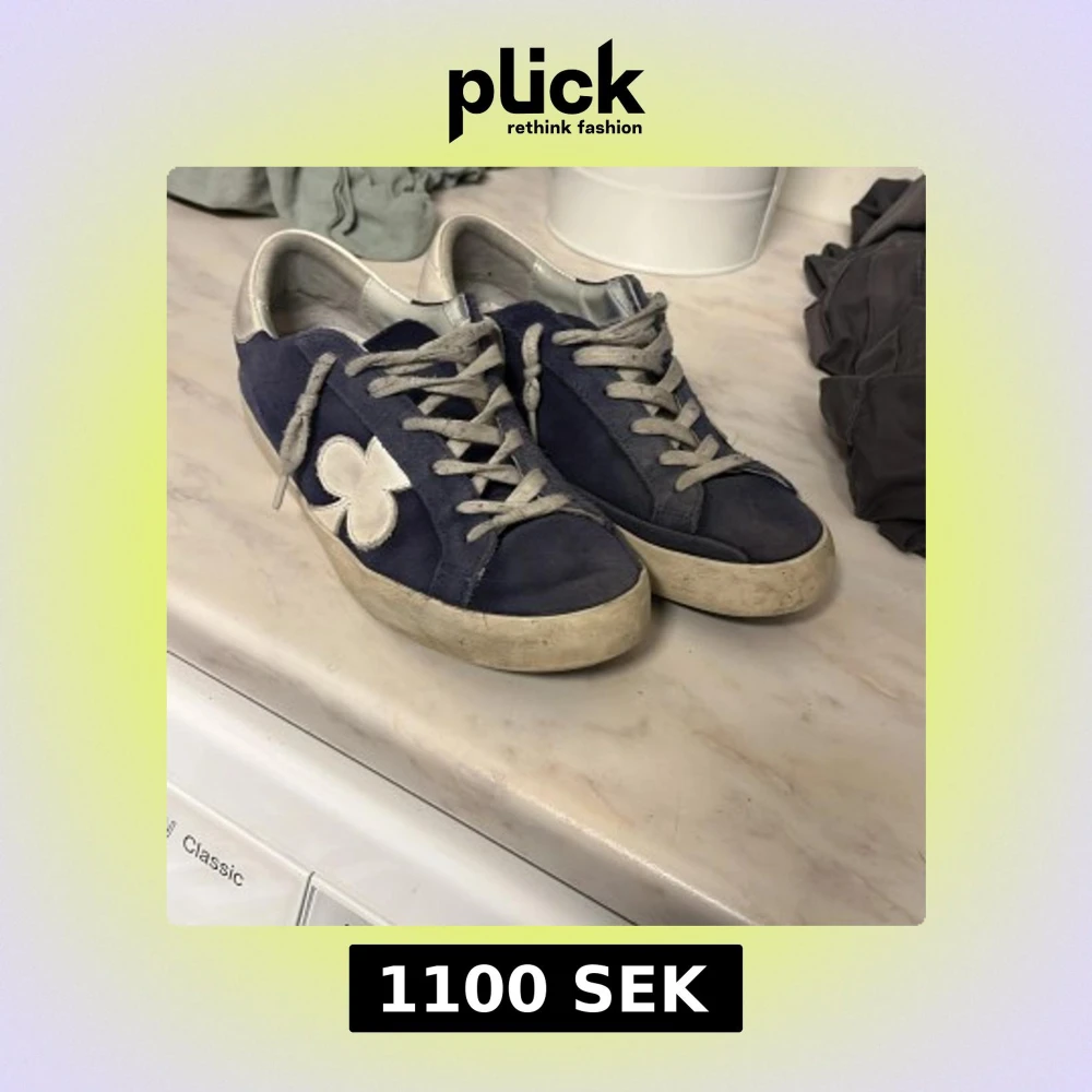 Säljer ett par blå sneakers från The Gallerist med vita detaljer och snörning. Skorna har en vit sula och en stor vit klöverdetalj på sidan. Perfekta för dig som gillar en sportig och avslappnad stil box ingår och ska borsta upp mockan och tvätta dom