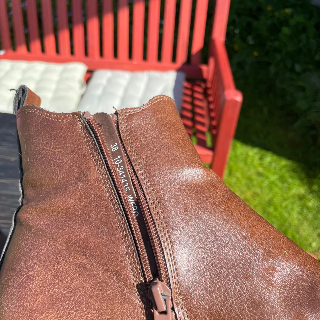 Snygga bruna läderstövlar i skinn med en klassisk design. De har en dragkedja på sidan. Perfekta för höst och vinter, passar till många olika outfits.