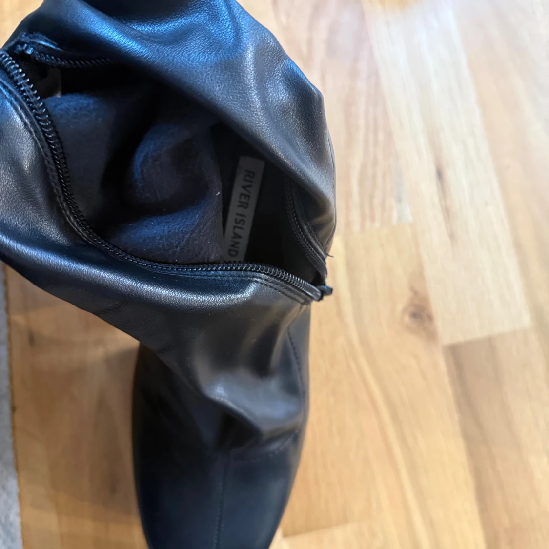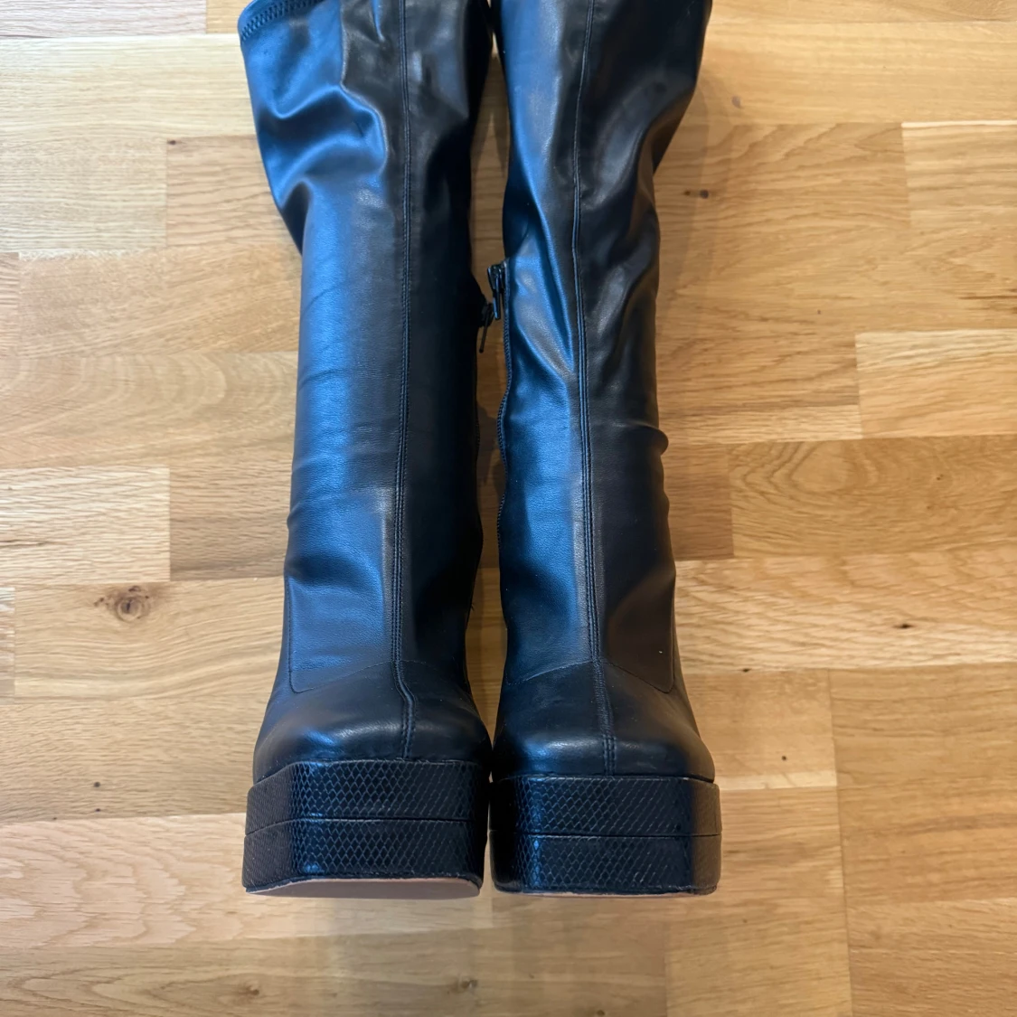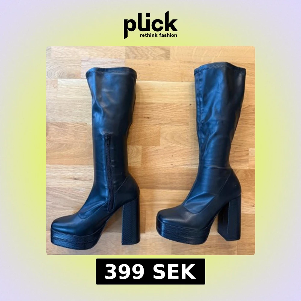 Snygga knähöga stövlar med rejäl klack och platå. Endast använda en gång – i nyskick! Tyvärr något för stora för mig, annars hade jag behållit dem. • Storlek: 38 • Färg: Svart • Material: Imitation leather • Klackhöjd: ca 12 cm • Platå: ca 4 cm • Bekväma att gå i trots höjden Perfekta till vinterns outfits – både till klänning och jeans. Nypris: 1069:-